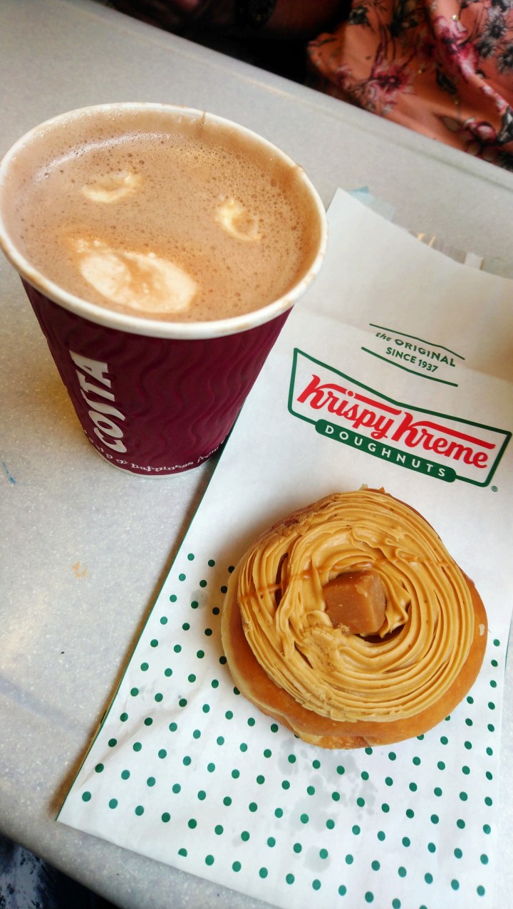 To truly put myself in holiday mode I decided to treat myself to a Costa hot chocolate and a Krispy Kreme doughnut. Did you know Costa are doing a special autumnal Bonfire Spice syrup? I didn’t, but that’s what I had in my hot chocolate and it was rather yummy! It smells amazing, I could sniff it forever, but unfortunately it is a bit more expensive than a hot chocolate needs to be. I partnered this with a salted caramel swirl doughnut, which was edible heaven in a paper bag.